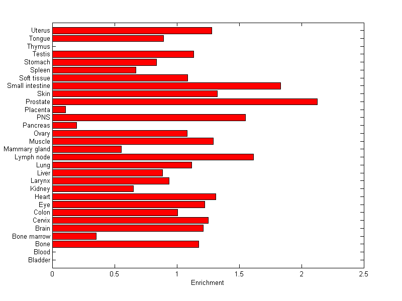 The expression level is normalized with tissue-library size. Each value for a gene in a tissue is a ratio of observed ESTs to the expected one in this tissue. The expected number of ESTs is the product of total ESTs of the gene and the fraction of total ESTs in the tissue among all ESTs in 30 tissues.