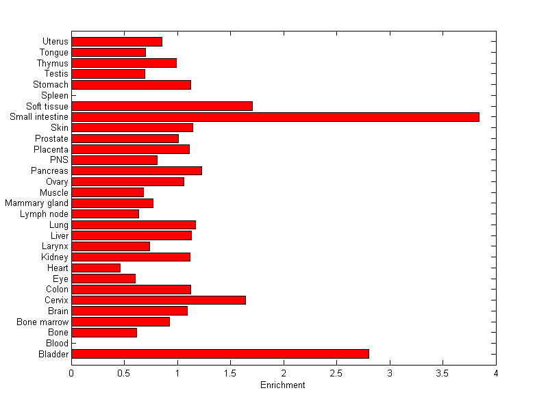 The expression level is normalized with tissue-library size. Each value for a gene in a tissue is a ratio of observed ESTs to the expected one in this tissue. The expected number of ESTs is the product of total ESTs of the gene and the fraction of total ESTs in the tissue among all ESTs in 30 tissues.