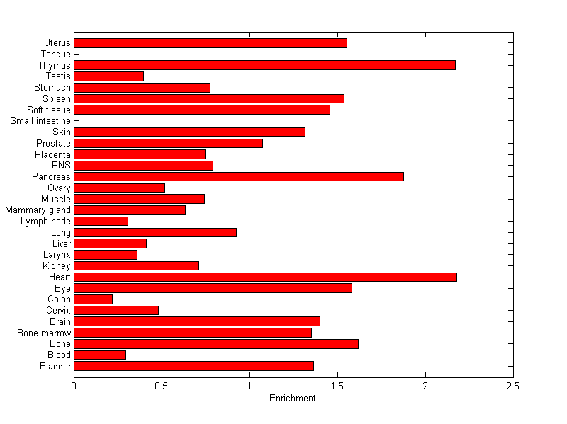 The expression level is normalized with tissue-library size. Each value for a gene in a tissue is a ratio of observed ESTs to the expected one in this tissue. The expected number of ESTs is the product of total ESTs of the gene and the fraction of total ESTs in the tissue among all ESTs in 30 tissues.