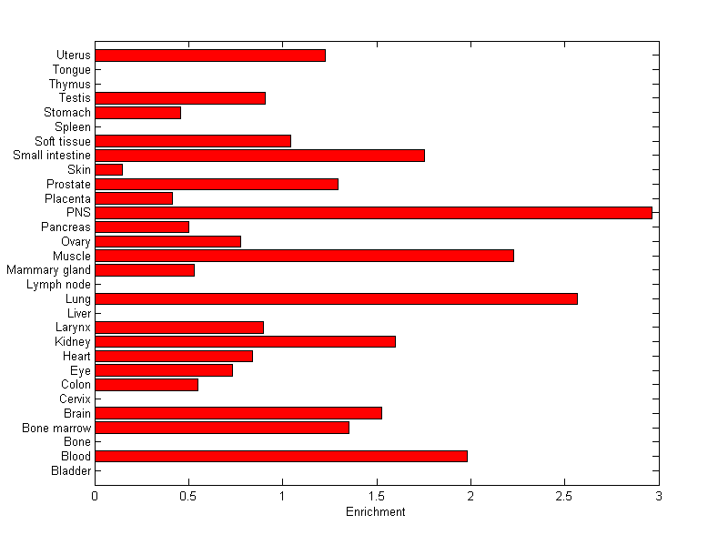 The expression level is normalized with tissue-library size. Each value for a gene in a tissue is a ratio of observed ESTs to the expected one in this tissue. The expected number of ESTs is the product of total ESTs of the gene and the fraction of total ESTs in the tissue among all ESTs in 30 tissues.