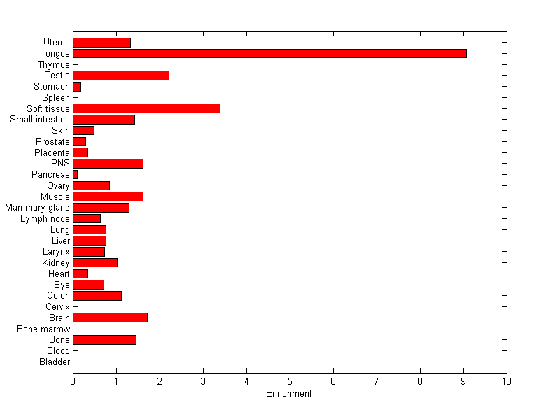 The expression level is normalized with tissue-library size. Each value for a gene in a tissue is a ratio of observed ESTs to the expected one in this tissue. The expected number of ESTs is the product of total ESTs of the gene and the fraction of total ESTs in the tissue among all ESTs in 30 tissues.