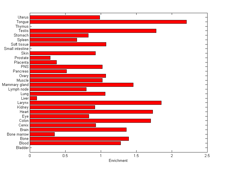 The expression level is normalized with tissue-library size. Each value for a gene in a tissue is a ratio of observed ESTs to the expected one in this tissue. The expected number of ESTs is the product of total ESTs of the gene and the fraction of total ESTs in the tissue among all ESTs in 30 tissues.