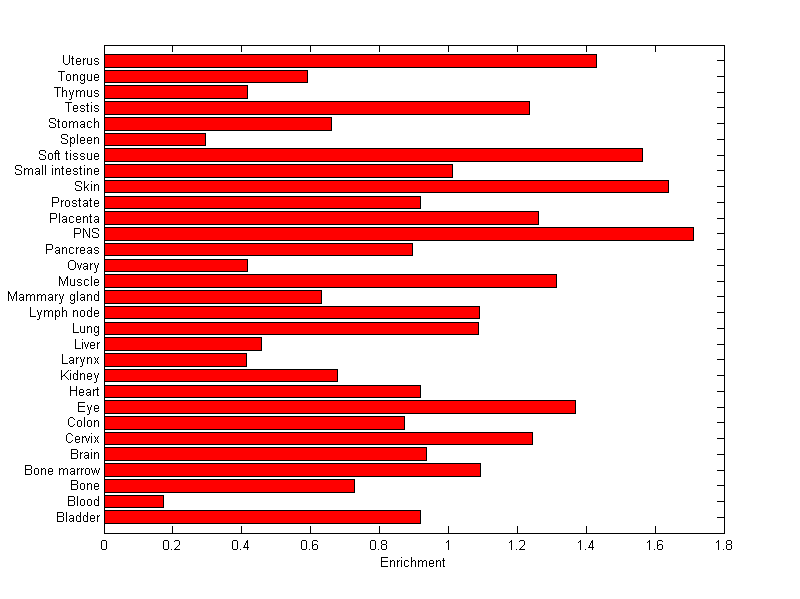 The expression level is normalized with tissue-library size. Each value for a gene in a tissue is a ratio of observed ESTs to the expected one in this tissue. The expected number of ESTs is the product of total ESTs of the gene and the fraction of total ESTs in the tissue among all ESTs in 30 tissues.