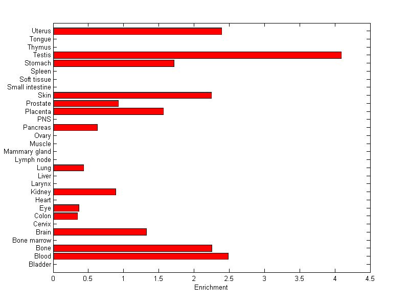 The expression level is normalized with tissue-library size. Each value for a gene in a tissue is a ratio of observed ESTs to the expected one in this tissue. The expected number of ESTs is the product of total ESTs of the gene and the fraction of total ESTs in the tissue among all ESTs in 30 tissues.