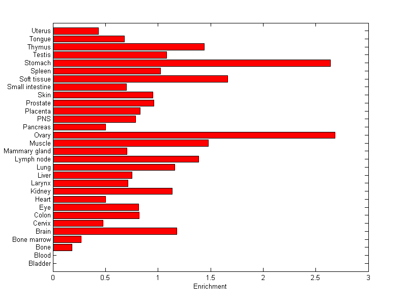 The expression level is normalized with tissue-library size. Each value for a gene in a tissue is a ratio of observed ESTs to the expected one in this tissue. The expected number of ESTs is the product of total ESTs of the gene and the fraction of total ESTs in the tissue among all ESTs in 30 tissues.