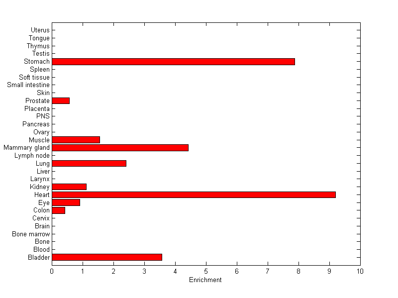 About the profile: The expression level is normalized with tissue-library size. Each value for a gene in a tissue is a ratio of observed ESTs to the expected one in this tissue. The expected number of ESTs is the product of total ESTs of the gene and the fraction of total ESTs in the tissue among all ESTs in 30 tissues. Summary: This gene is preferentially expressed in [heart, stomach] Download: |