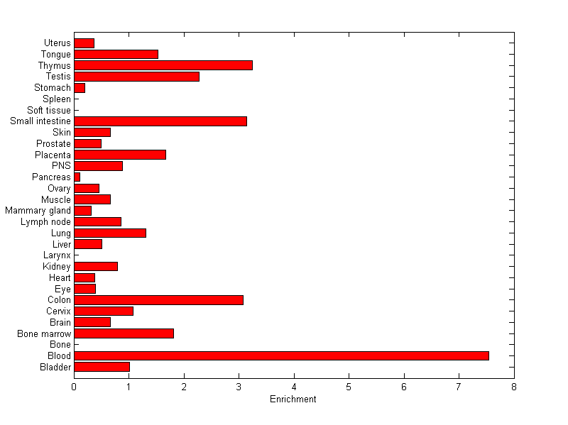 The expression level is normalized with tissue-library size. Each value for a gene in a tissue is a ratio of observed ESTs to the expected one in this tissue. The expected number of ESTs is the product of total ESTs of the gene and the fraction of total ESTs in the tissue among all ESTs in 30 tissues.