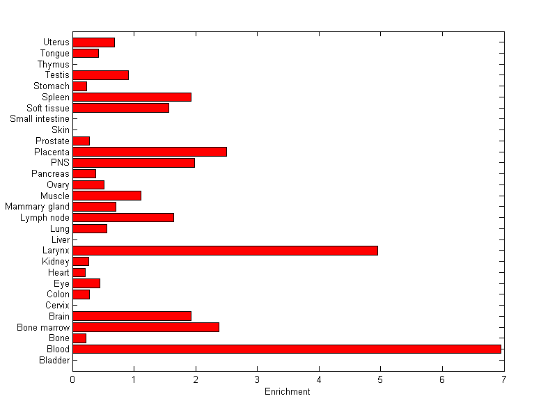 The expression level is normalized with tissue-library size. Each value for a gene in a tissue is a ratio of observed ESTs to the expected one in this tissue. The expected number of ESTs is the product of total ESTs of the gene and the fraction of total ESTs in the tissue among all ESTs in 30 tissues.