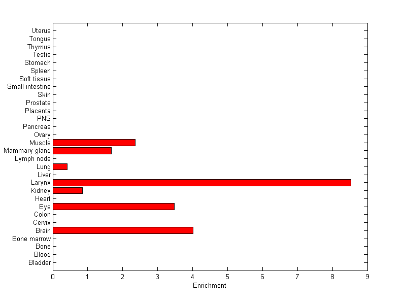 The expression level is normalized with tissue-library size. Each value for a gene in a tissue is a ratio of observed ESTs to the expected one in this tissue. The expected number of ESTs is the product of total ESTs of the gene and the fraction of total ESTs in the tissue among all ESTs in 30 tissues.
