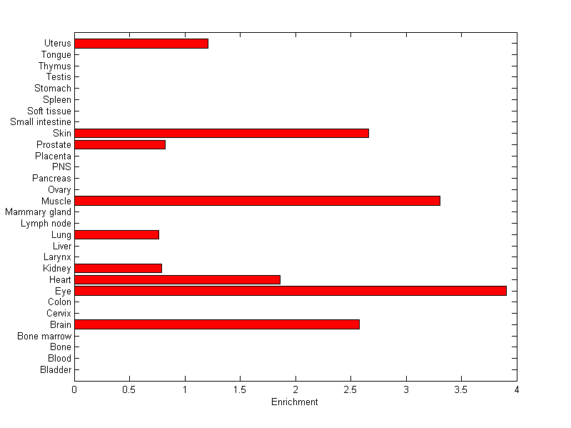 The expression level is normalized with tissue-library size. Each value for a gene in a tissue is a ratio of observed ESTs to the expected one in this tissue. The expected number of ESTs is the product of total ESTs of the gene and the fraction of total ESTs in the tissue among all ESTs in 30 tissues.