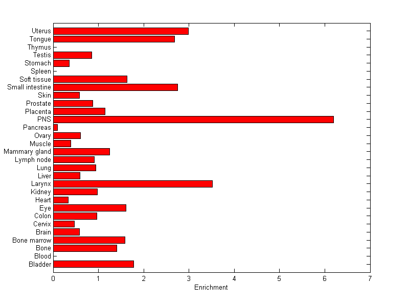 The expression level is normalized with tissue-library size. Each value for a gene in a tissue is a ratio of observed ESTs to the expected one in this tissue. The expected number of ESTs is the product of total ESTs of the gene and the fraction of total ESTs in the tissue among all ESTs in 30 tissues.