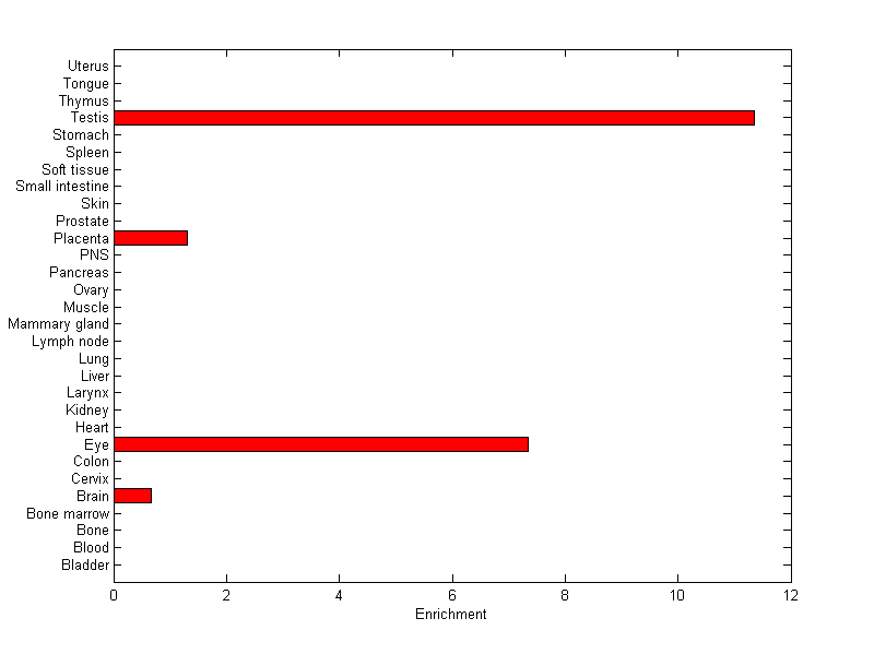 The expression level is normalized with tissue-library size. Each value for a gene in a tissue is a ratio of observed ESTs to the expected one in this tissue. The expected number of ESTs is the product of total ESTs of the gene and the fraction of total ESTs in the tissue among all ESTs in 30 tissues.
