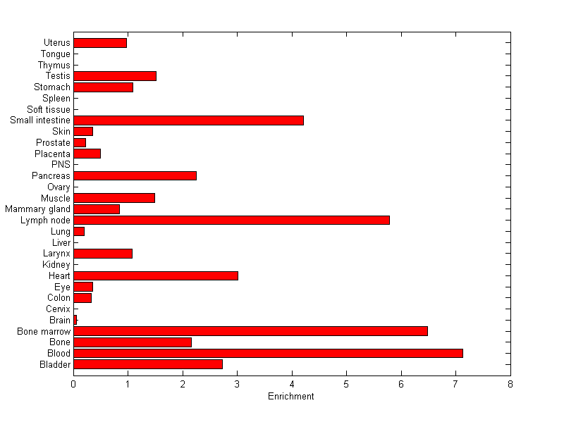 About the profile: The expression level is normalized with tissue-library size. Each value for a gene in a tissue is a ratio of observed ESTs to the expected one in this tissue. The expected number of ESTs is the product of total ESTs of the gene and the fraction of total ESTs in the tissue among all ESTs in 30 tissues. Summary: This gene is preferentially expressed in [blood, bone_marrow, lymph_node] Download: |