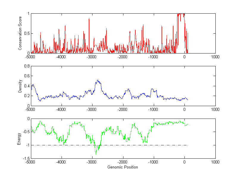 About the profiles: The conservation profile (red curve) is about conservation scores of the promoter sequences. Conservation was determined from an eight-way alignment of human, chimpanzee, dog, mouse, rat, chicken, zebrafish and fugu sequences. The conservation was quantified by a conservation score between 0 and 1, with 1 as highest conservation. The conservation score was obtained from UCSC genome databases. The density profile (blue curve) is about density of all TF binding sites. The energy profile (green curve) is about energy for module detection based on TF interaction. The positions with energy less than -1 indicate the existence of CRMs. Download: Conservation profileDensity profile Energy profile CRM summary |