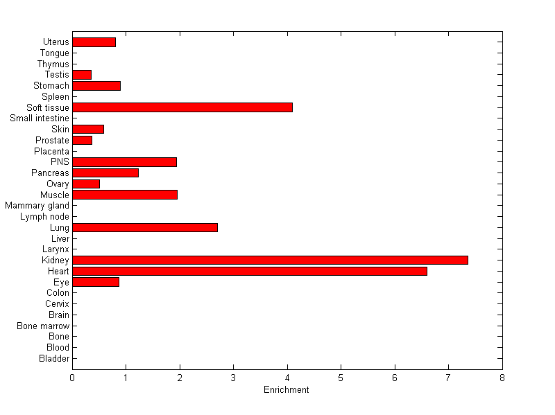 About the profile: The expression level is normalized with tissue-library size. Each value for a gene in a tissue is a ratio of observed ESTs to the expected one in this tissue. The expected number of ESTs is the product of total ESTs of the gene and the fraction of total ESTs in the tissue among all ESTs in 30 tissues. Summary: This gene is preferentially expressed in [heart, kidney] Download: |