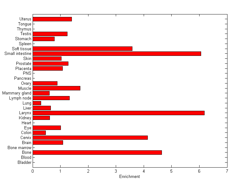 The expression level is normalized with tissue-library size. Each value for a gene in a tissue is a ratio of observed ESTs to the expected one in this tissue. The expected number of ESTs is the product of total ESTs of the gene and the fraction of total ESTs in the tissue among all ESTs in 30 tissues.