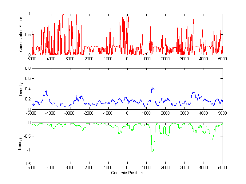 The energy profile (green curve) is about energy for module detection based on TF interaction. The positions with energy less than -1 indicate the existence of CRMs.