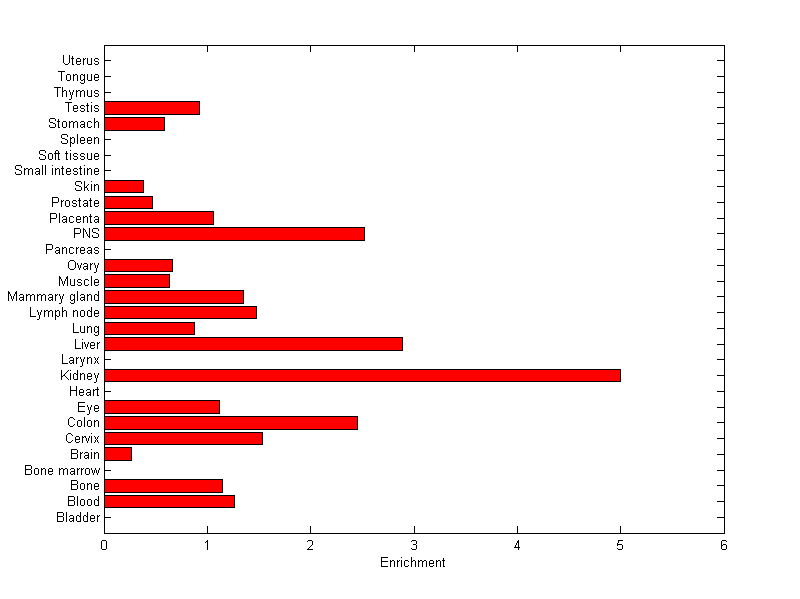 The expression level is normalized with tissue-library size. Each value for a gene in a tissue is a ratio of observed ESTs to the expected one in this tissue. The expected number of ESTs is the product of total ESTs of the gene and the fraction of total ESTs in the tissue among all ESTs in 30 tissues.