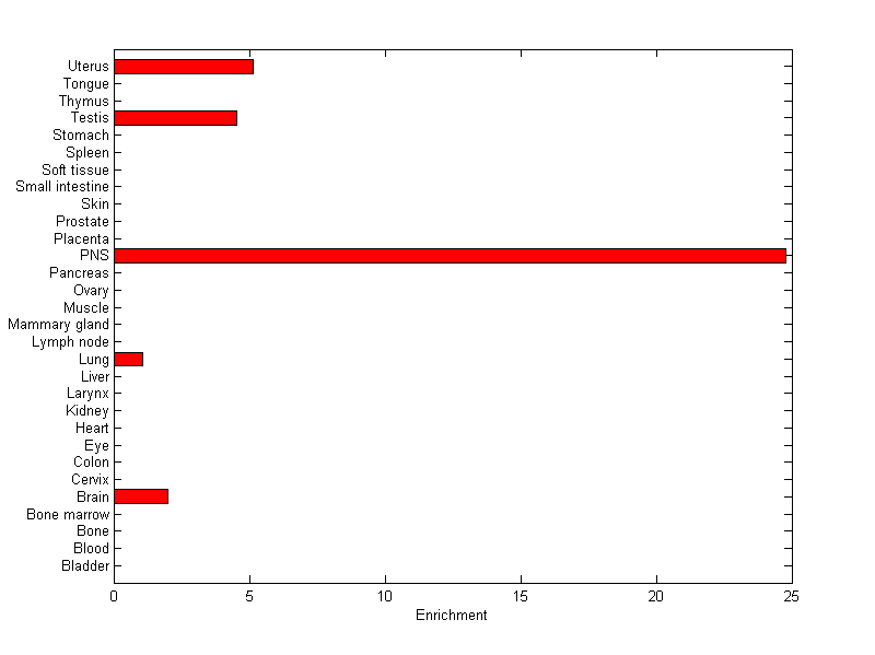 The expression level is normalized with tissue-library size. Each value for a gene in a tissue is a ratio of observed ESTs to the expected one in this tissue. The expected number of ESTs is the product of total ESTs of the gene and the fraction of total ESTs in the tissue among all ESTs in 30 tissues.