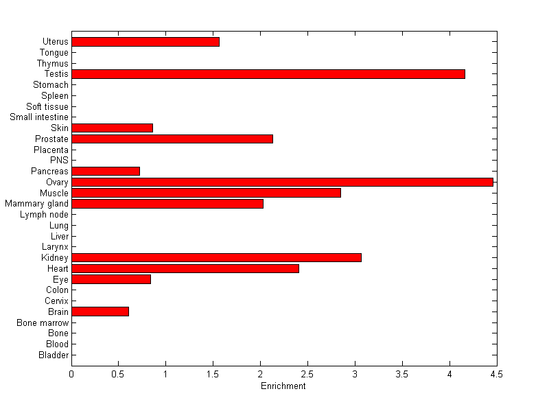 The expression level is normalized with tissue-library size. Each value for a gene in a tissue is a ratio of observed ESTs to the expected one in this tissue. The expected number of ESTs is the product of total ESTs of the gene and the fraction of total ESTs in the tissue among all ESTs in 30 tissues.