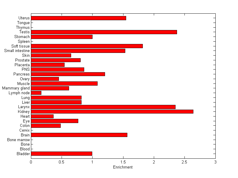 The expression level is normalized with tissue-library size. Each value for a gene in a tissue is a ratio of observed ESTs to the expected one in this tissue. The expected number of ESTs is the product of total ESTs of the gene and the fraction of total ESTs in the tissue among all ESTs in 30 tissues.