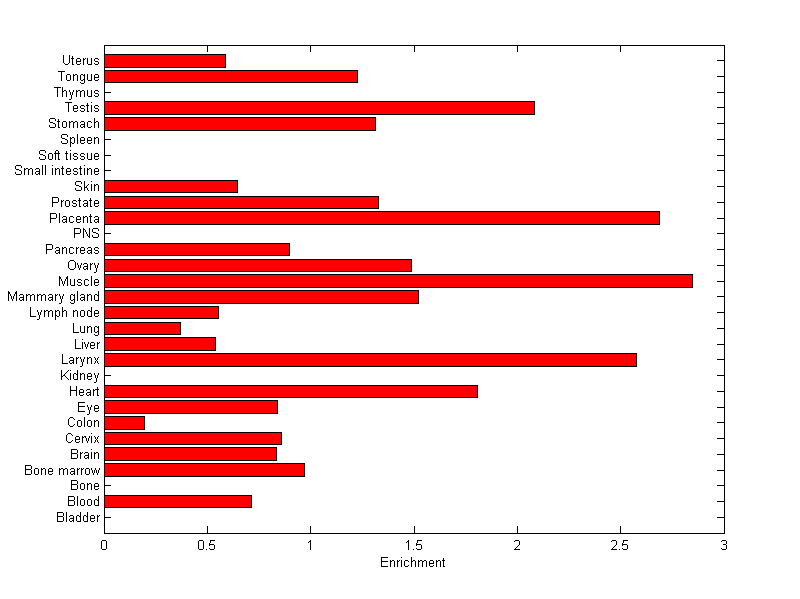 The expression level is normalized with tissue-library size. Each value for a gene in a tissue is a ratio of observed ESTs to the expected one in this tissue. The expected number of ESTs is the product of total ESTs of the gene and the fraction of total ESTs in the tissue among all ESTs in 30 tissues.