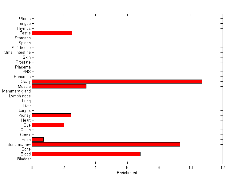 The expression level is normalized with tissue-library size. Each value for a gene in a tissue is a ratio of observed ESTs to the expected one in this tissue. The expected number of ESTs is the product of total ESTs of the gene and the fraction of total ESTs in the tissue among all ESTs in 30 tissues.