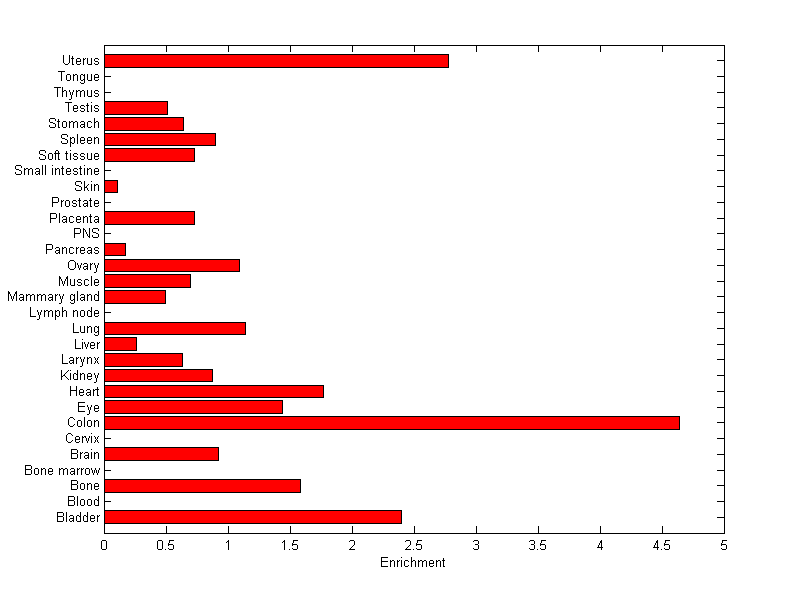 The expression level is normalized with tissue-library size. Each value for a gene in a tissue is a ratio of observed ESTs to the expected one in this tissue. The expected number of ESTs is the product of total ESTs of the gene and the fraction of total ESTs in the tissue among all ESTs in 30 tissues.