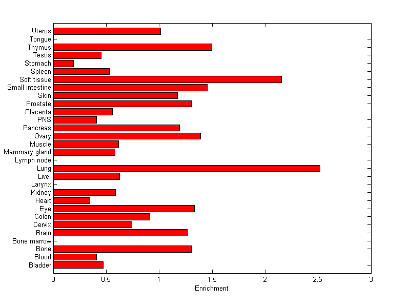 The expression level is normalized with tissue-library size. Each value for a gene in a tissue is a ratio of observed ESTs to the expected one in this tissue. The expected number of ESTs is the product of total ESTs of the gene and the fraction of total ESTs in the tissue among all ESTs in 30 tissues.