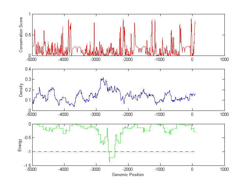 About the profiles: The conservation profile (red curve) is about conservation scores of the promoter sequences. Conservation was determined from an eight-way alignment of human, chimpanzee, dog, mouse, rat, chicken, zebrafish and fugu sequences. The conservation was quantified by a conservation score between 0 and 1, with 1 as highest conservation. The conservation score was obtained from UCSC genome databases. The density profile (blue curve) is about density of all TF binding sites. The energy profile (green curve) is about energy for module detection based on TF interaction. The positions with energy less than -1 indicate the existence of CRMs. Download: Conservation profileDensity profile Energy profile CRM summary |