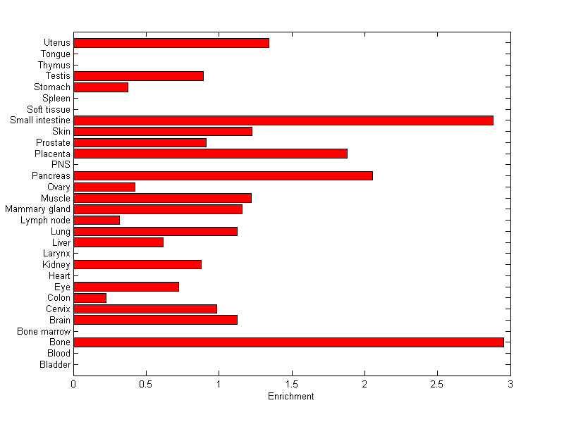 The expression level is normalized with tissue-library size. Each value for a gene in a tissue is a ratio of observed ESTs to the expected one in this tissue. The expected number of ESTs is the product of total ESTs of the gene and the fraction of total ESTs in the tissue among all ESTs in 30 tissues.