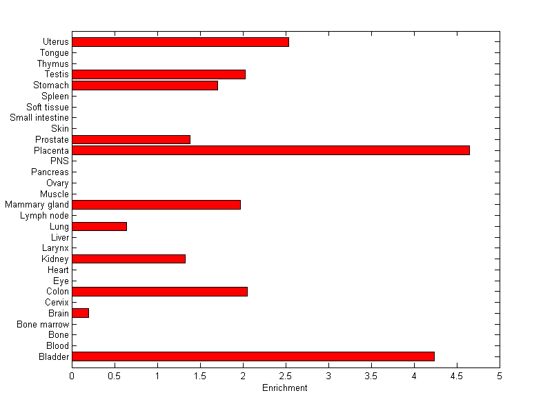 The expression level is normalized with tissue-library size. Each value for a gene in a tissue is a ratio of observed ESTs to the expected one in this tissue. The expected number of ESTs is the product of total ESTs of the gene and the fraction of total ESTs in the tissue among all ESTs in 30 tissues.