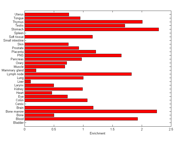 The expression level is normalized with tissue-library size. Each value for a gene in a tissue is a ratio of observed ESTs to the expected one in this tissue. The expected number of ESTs is the product of total ESTs of the gene and the fraction of total ESTs in the tissue among all ESTs in 30 tissues.
