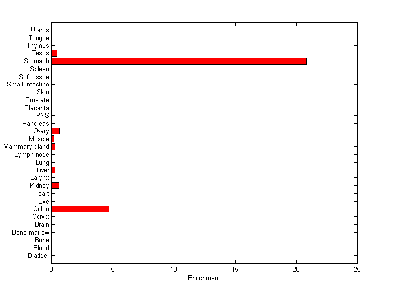 The expression level is normalized with tissue-library size. Each value for a gene in a tissue is a ratio of observed ESTs to the expected one in this tissue. The expected number of ESTs is the product of total ESTs of the gene and the fraction of total ESTs in the tissue among all ESTs in 30 tissues.