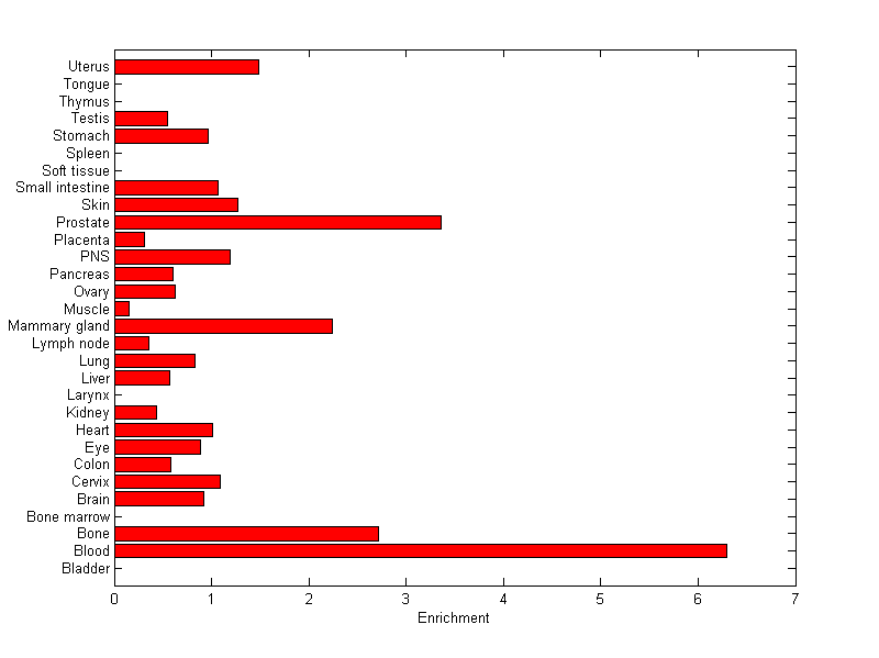 The expression level is normalized with tissue-library size. Each value for a gene in a tissue is a ratio of observed ESTs to the expected one in this tissue. The expected number of ESTs is the product of total ESTs of the gene and the fraction of total ESTs in the tissue among all ESTs in 30 tissues.