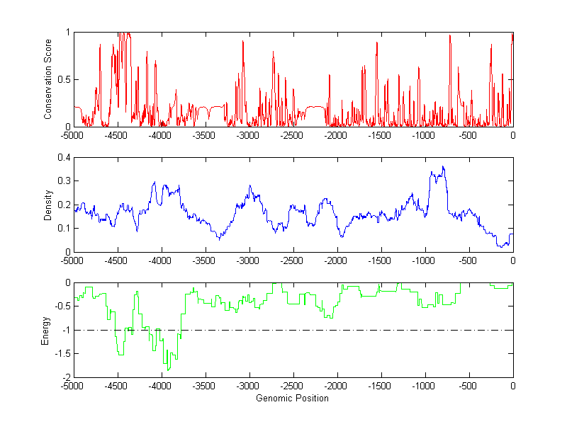 The energy profile (green curve) is about energy for module detection based on TF interaction. The positions with energy less than -1 indicate the existence of CRMs.