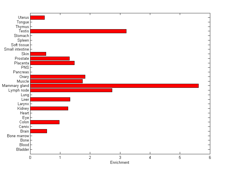 The expression level is normalized with tissue-library size. Each value for a gene in a tissue is a ratio of observed ESTs to the expected one in this tissue. The expected number of ESTs is the product of total ESTs of the gene and the fraction of total ESTs in the tissue among all ESTs in 30 tissues.
