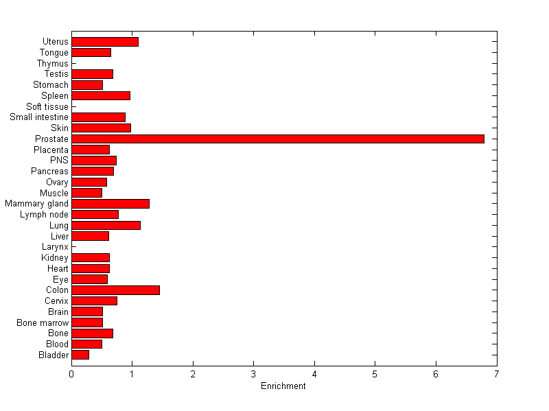 About the profile: The expression level is normalized with tissue-library size. Each value for a gene in a tissue is a ratio of observed ESTs to the expected one in this tissue. The expected number of ESTs is the product of total ESTs of the gene and the fraction of total ESTs in the tissue among all ESTs in 30 tissues. Summary: This gene is preferentially expressed in [prostate] Download: |