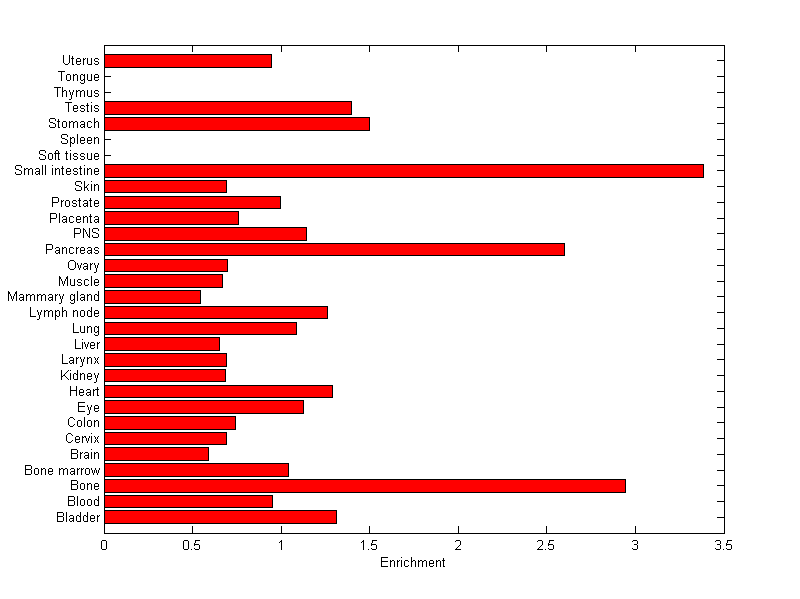 The expression level is normalized with tissue-library size. Each value for a gene in a tissue is a ratio of observed ESTs to the expected one in this tissue. The expected number of ESTs is the product of total ESTs of the gene and the fraction of total ESTs in the tissue among all ESTs in 30 tissues.