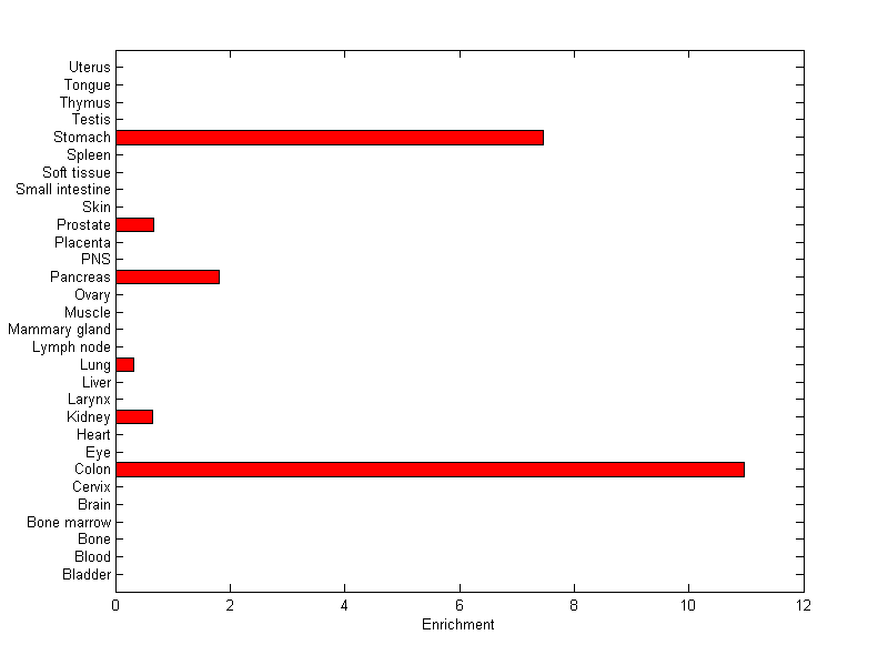 About the profile: The expression level is normalized with tissue-library size. Each value for a gene in a tissue is a ratio of observed ESTs to the expected one in this tissue. The expected number of ESTs is the product of total ESTs of the gene and the fraction of total ESTs in the tissue among all ESTs in 30 tissues. Summary: This gene is preferentially expressed in [colon, stomach] Download: |