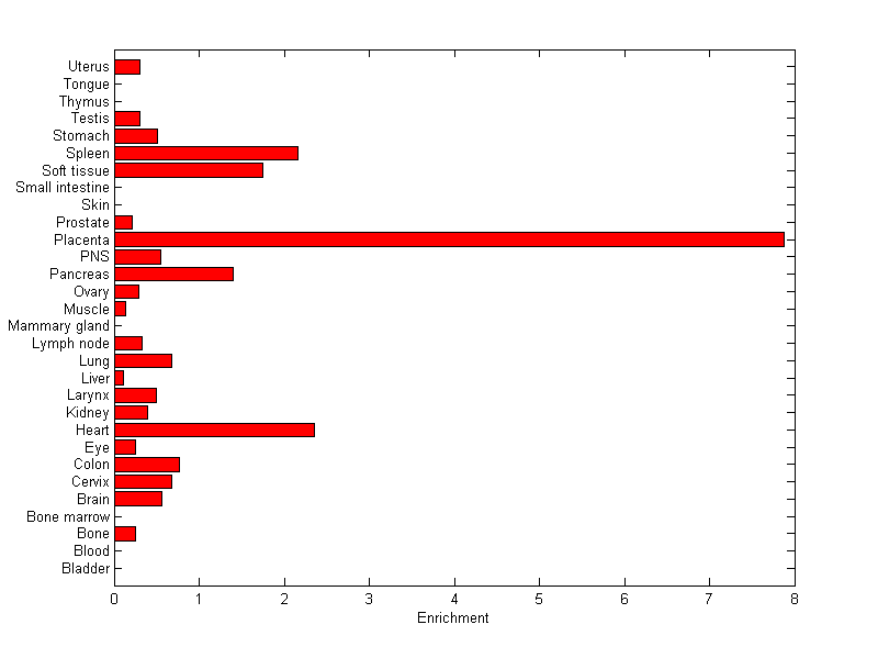 The expression level is normalized with tissue-library size. Each value for a gene in a tissue is a ratio of observed ESTs to the expected one in this tissue. The expected number of ESTs is the product of total ESTs of the gene and the fraction of total ESTs in the tissue among all ESTs in 30 tissues.