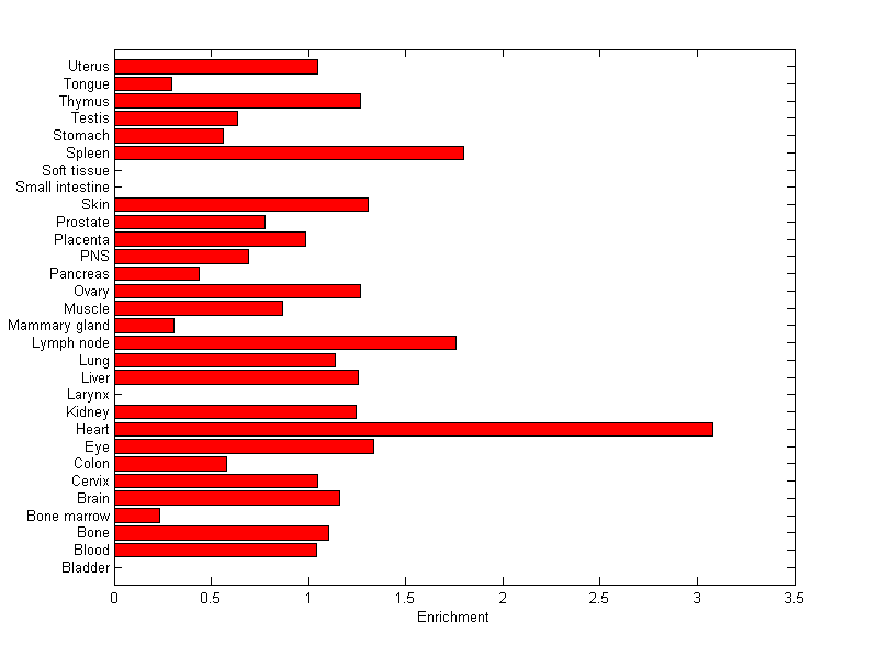 The expression level is normalized with tissue-library size. Each value for a gene in a tissue is a ratio of observed ESTs to the expected one in this tissue. The expected number of ESTs is the product of total ESTs of the gene and the fraction of total ESTs in the tissue among all ESTs in 30 tissues.