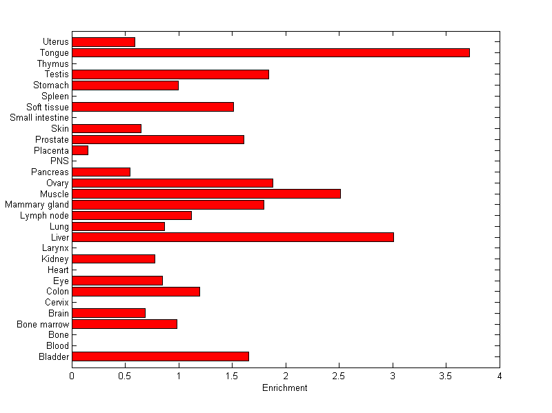 The expression level is normalized with tissue-library size. Each value for a gene in a tissue is a ratio of observed ESTs to the expected one in this tissue. The expected number of ESTs is the product of total ESTs of the gene and the fraction of total ESTs in the tissue among all ESTs in 30 tissues.
