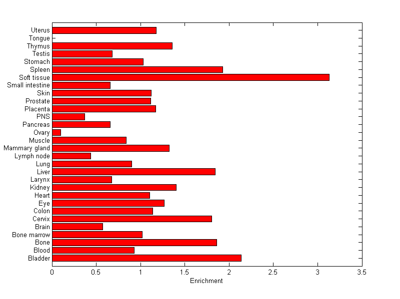 The expression level is normalized with tissue-library size. Each value for a gene in a tissue is a ratio of observed ESTs to the expected one in this tissue. The expected number of ESTs is the product of total ESTs of the gene and the fraction of total ESTs in the tissue among all ESTs in 30 tissues.