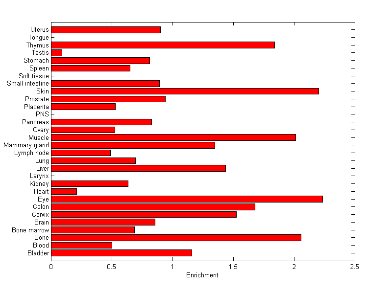 The expression level is normalized with tissue-library size. Each value for a gene in a tissue is a ratio of observed ESTs to the expected one in this tissue. The expected number of ESTs is the product of total ESTs of the gene and the fraction of total ESTs in the tissue among all ESTs in 30 tissues.