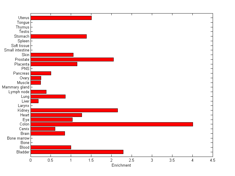 The expression level is normalized with tissue-library size. Each value for a gene in a tissue is a ratio of observed ESTs to the expected one in this tissue. The expected number of ESTs is the product of total ESTs of the gene and the fraction of total ESTs in the tissue among all ESTs in 30 tissues.