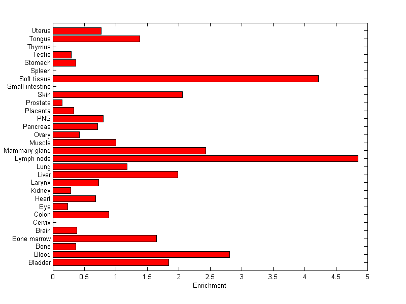 The expression level is normalized with tissue-library size. Each value for a gene in a tissue is a ratio of observed ESTs to the expected one in this tissue. The expected number of ESTs is the product of total ESTs of the gene and the fraction of total ESTs in the tissue among all ESTs in 30 tissues.