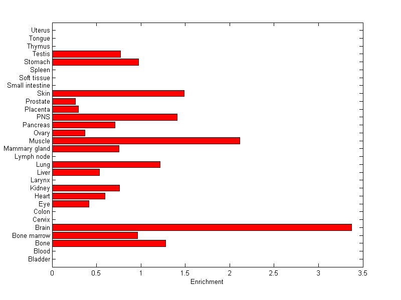 The expression level is normalized with tissue-library size. Each value for a gene in a tissue is a ratio of observed ESTs to the expected one in this tissue. The expected number of ESTs is the product of total ESTs of the gene and the fraction of total ESTs in the tissue among all ESTs in 30 tissues.