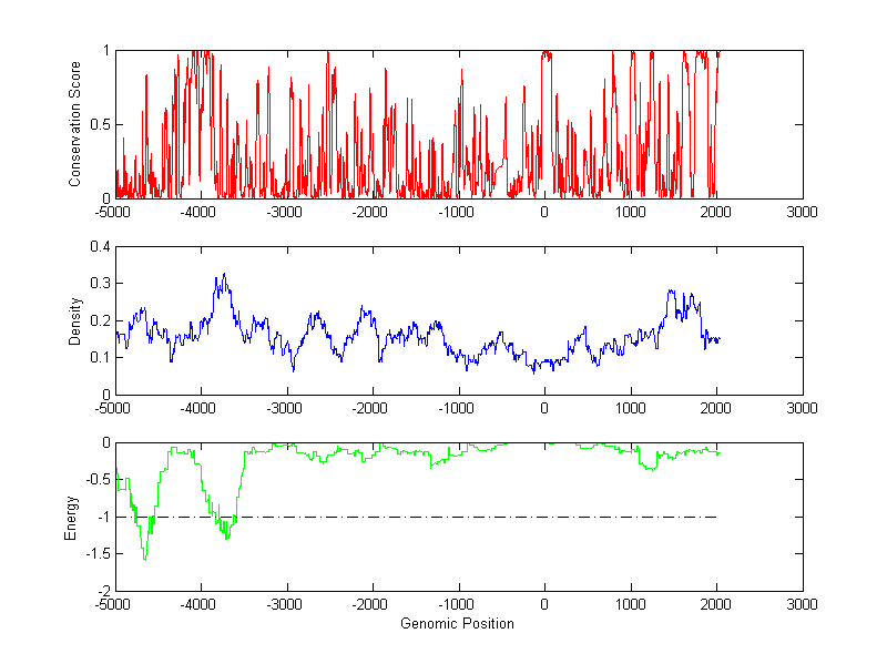 The energy profile (green curve) is about energy for module detection based on TF interaction. The positions with energy less than -1 indicate the existence of CRMs.
