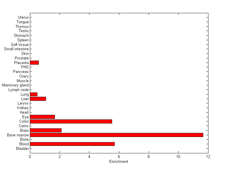 The expression level is normalized with tissue-library size. Each value for a gene in a tissue is a ratio of observed ESTs to the expected one in this tissue. The expected number of ESTs is the product of total ESTs of the gene and the fraction of total ESTs in the tissue among all ESTs in 30 tissues.
